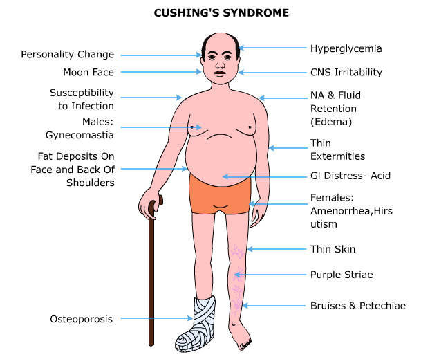It is difficult to diagnose Cushing syndrome, particularly endogenous Cushing syndrome, because other conditions share the same signs and symptoms. It will be required to conduct a physical exam, to look for signs of Cushing syndrome. He or she may suspect Cushing syndrome if you have signs such as rounding of the face (moon face), a pad of fatty tissue between the shoulders and neck (buffalo hump), and thin skin with bruises and stretch marks.